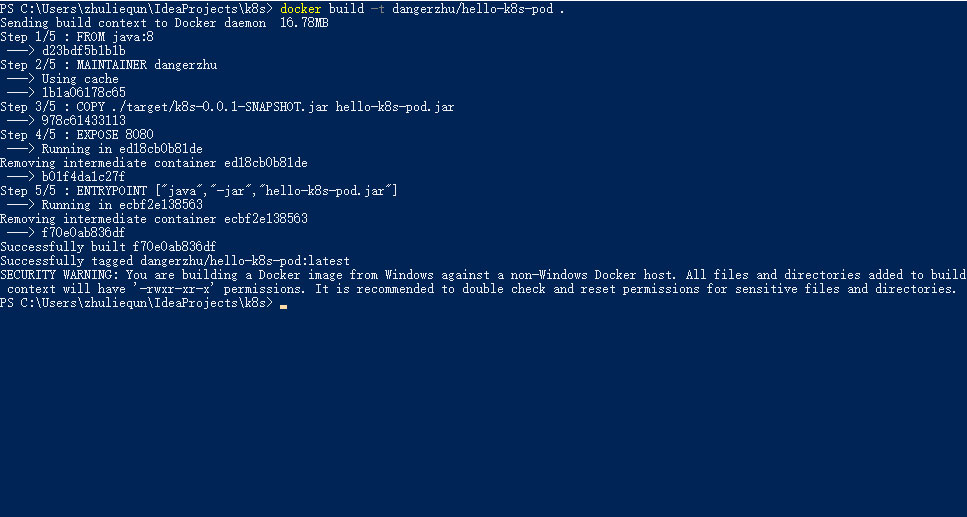 使用docker build -t dangerzhu/hello-k8s-pod . 命令構(gòu)建一個(gè)dangerzhu/hello-k8s-pod 鏡像,如圖所示: