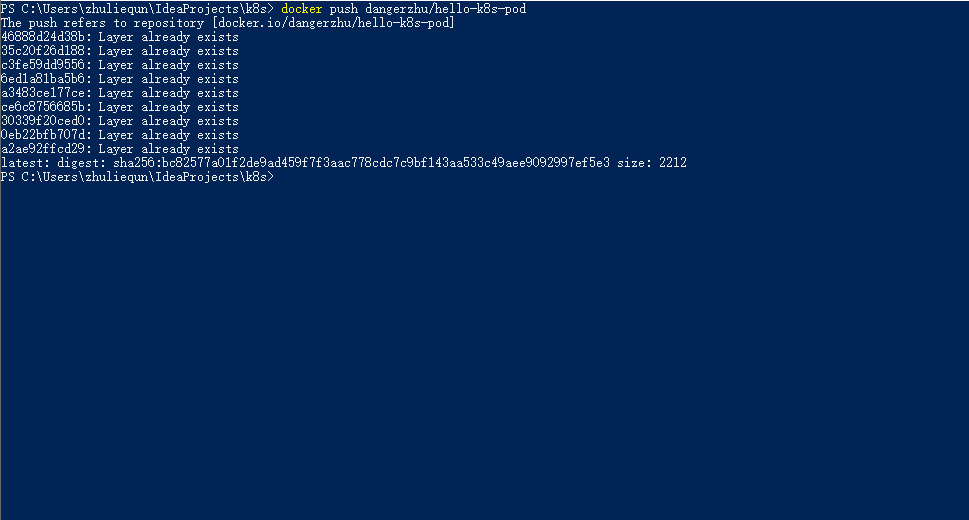 使用dangerzhu賬戶登錄docker,并使用命令docker push dangerzhu/hello-k8s-pod 將dangerzhu/hello-k8s-pod鏡像推送到鏡像倉庫,如圖所示: