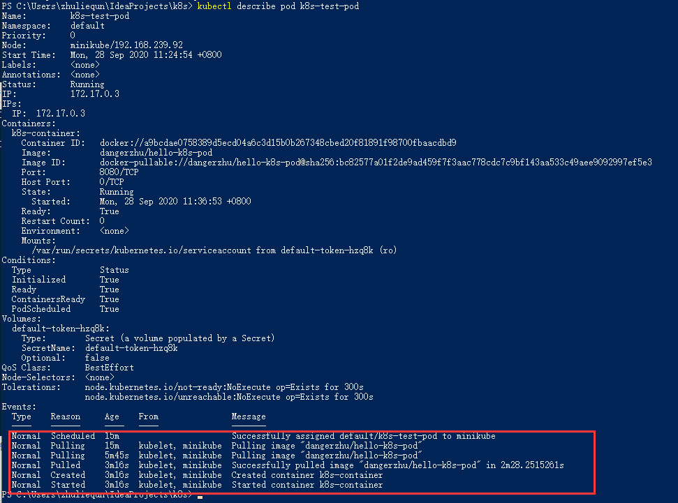 由此可知k8s-test-pod已經(jīng)創(chuàng)建,根據(jù)狀態(tài)STATUS:ContainerCreating,可以知道容器正在創(chuàng)建,使用命令kubectl describe pod k8s-test-pod查看pod中k8s-container容器創(chuàng)建的具體信息,如圖所示: