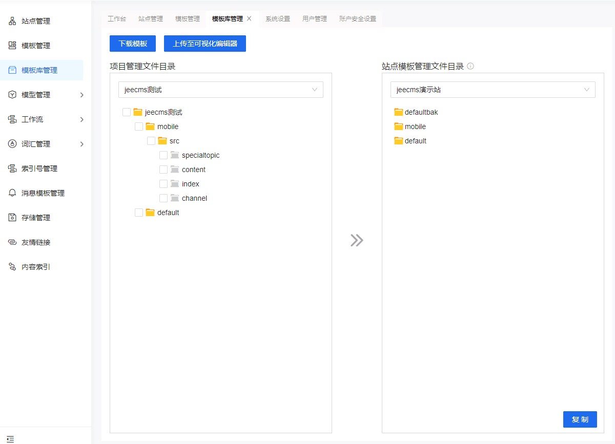 JEECMS X2.3.1版本中對于模板的相關功能以及與低代碼平臺的數(shù)據交互問題進行了深度優(yōu)化,目前我們實現(xiàn)了在CMS系統(tǒng)中批量下載低代碼平臺中的項目模板文件并支持多站點應用,這一改進徹底解決了以往需要在各個主站和子站之間頻繁登錄、切換站點以及單獨配置站點模板的困擾。對于管理大規(guī)模網站項目和眾多站點的用戶來說,這將帶來更為友好的使用體驗。