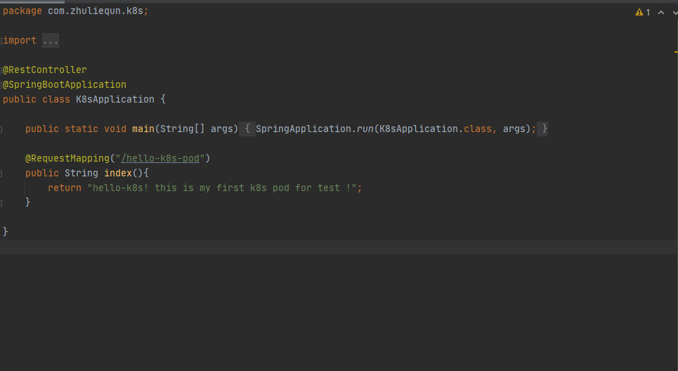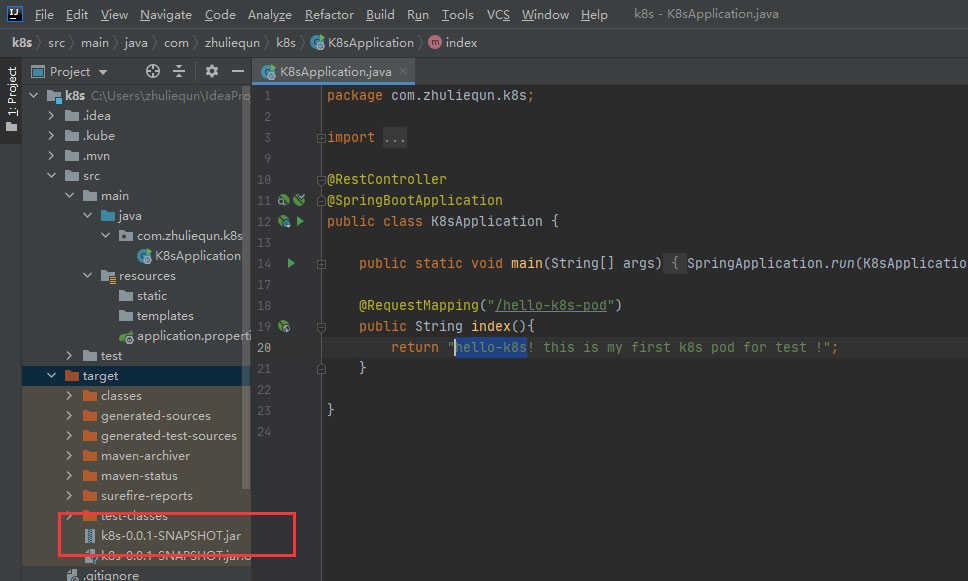 我們用Idea創(chuàng)建一個(gè)名為k8s的springboot項(xiàng)目,對(duì)外暴露一個(gè)接口,輸出:hello-k8s,this is my first k8s pod,如圖所示: