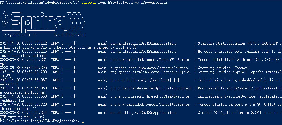 使用命令kubectl logs k8s-test-pod -c k8s-container 查看容器運(yùn)行日志,如圖所示: