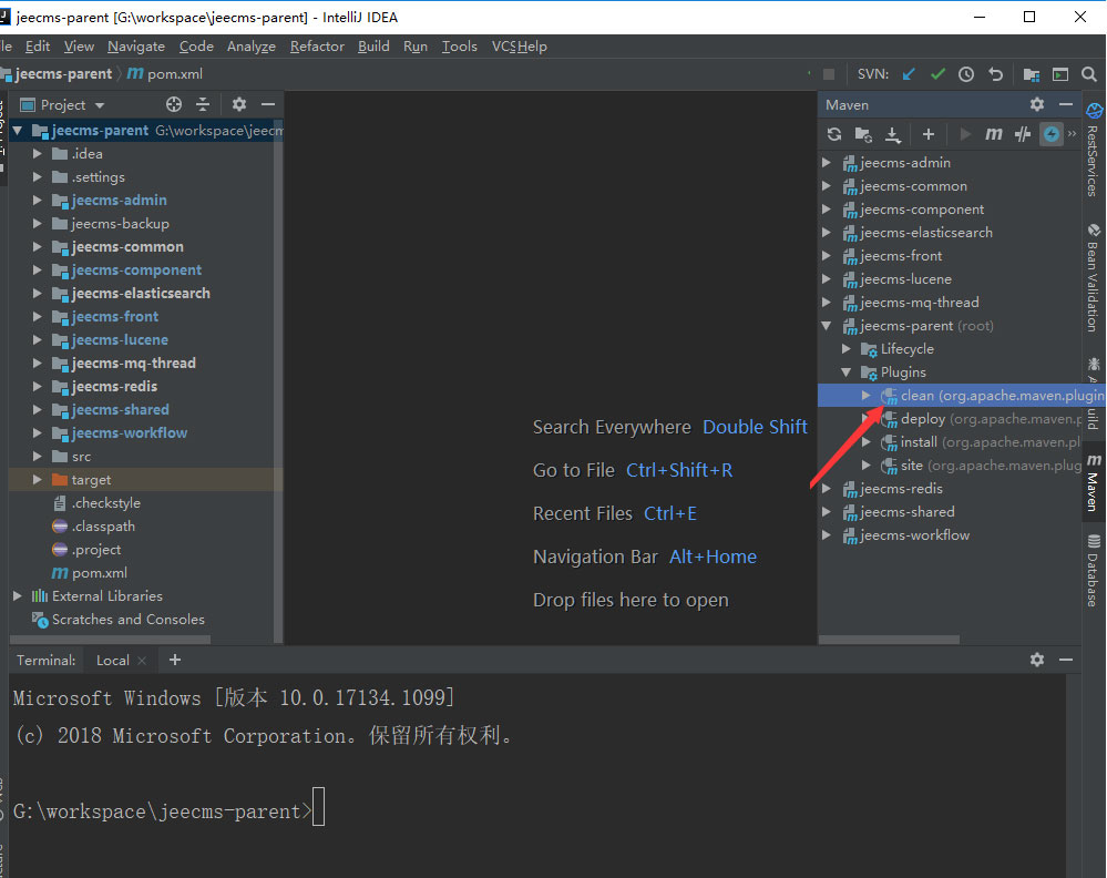3.展開jeecms-parent, 后面帶(root)的那個; 雙擊如圖所示的clean