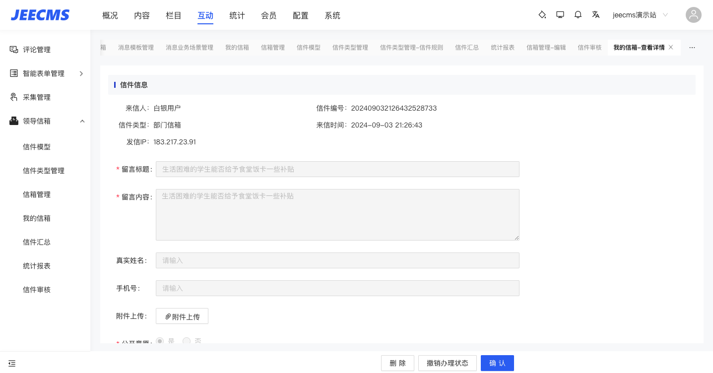 激情一“夏”,JEECMS新版本來襲,x2.8此次更新了領(lǐng)導(dǎo)信箱和消息管理2大重要的實(shí)用性功能,讓小編帶您看看兩個(gè)功能的圖文介紹吧:
