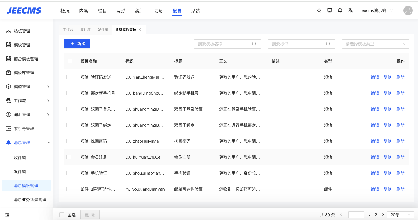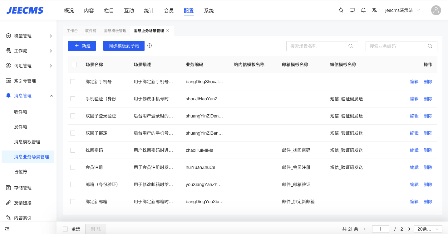 2.消息通知場(chǎng)景多樣化是真實(shí)的需求痛點(diǎn),不同的應(yīng)用,配置不同的場(chǎng)景模板,讓信息交互更清晰、工作交流更高效,這就是jeecms一直秉承的研發(fā)理念。